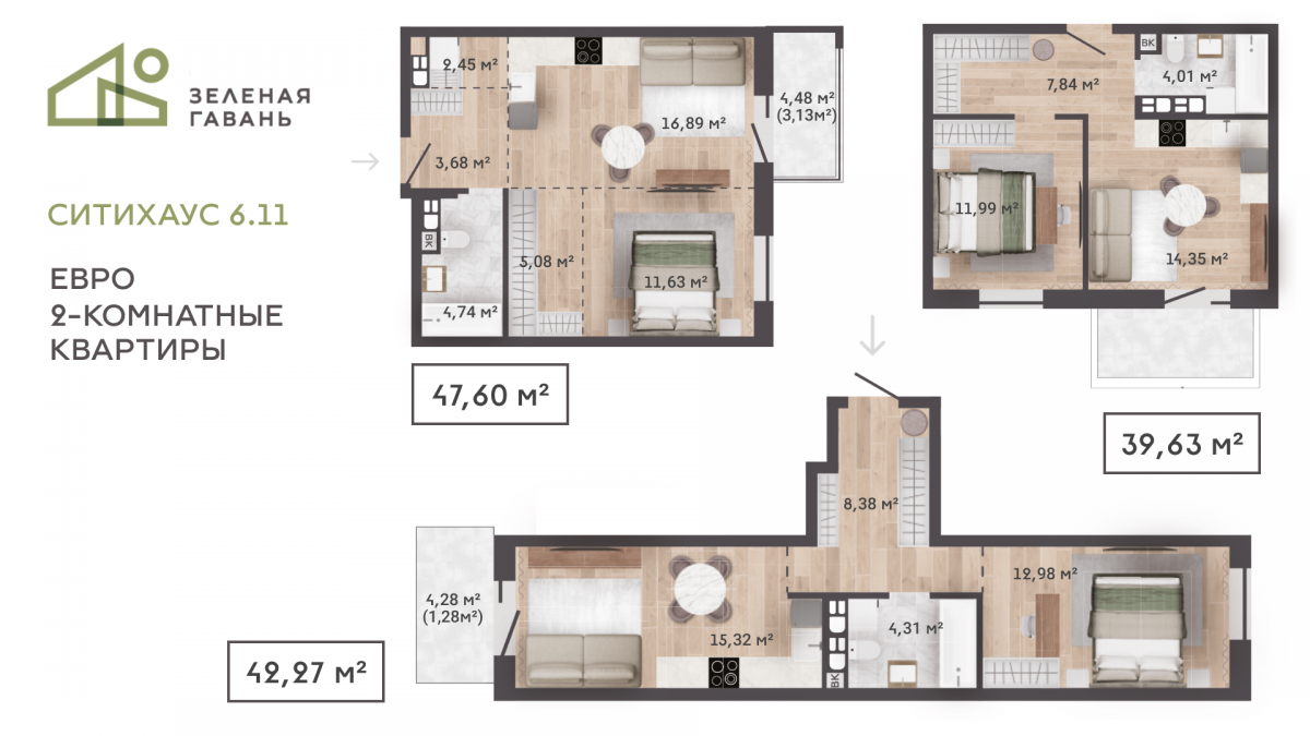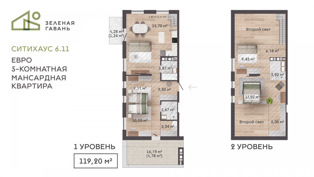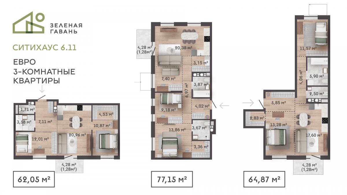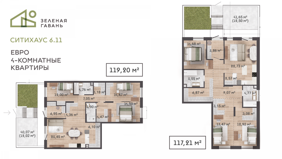 Среди отличий – квартиры с личными входами со стороны зеленого коридора. Попасть домой можно будет через просторную террасу. Такой прием в Зеленой гавани используют впервые – он привнесет ощущение таунхауса, но по цене городской квартиры. Масштаб террас сравним с отдельной квартирой – до 60,58 кв.м. Одни будут вымощены плиткой, на других высадят газон, а некоторые будет сочетать и то, и другое.
