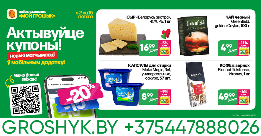 Мы уже рассказывали о возможности экономить с помощью купонов в мобильном приложении «МОЙ ГРОШЫК». В этот раз по специальной цене со 2 по 15 февраля можно приобрести чай и кофе, сладости, бытовую химию, средства гигиены и многое другое. В дискаунтерах «Грошык» они обозначены специальными надценниками. Вот лишь некоторые из этих товаров: