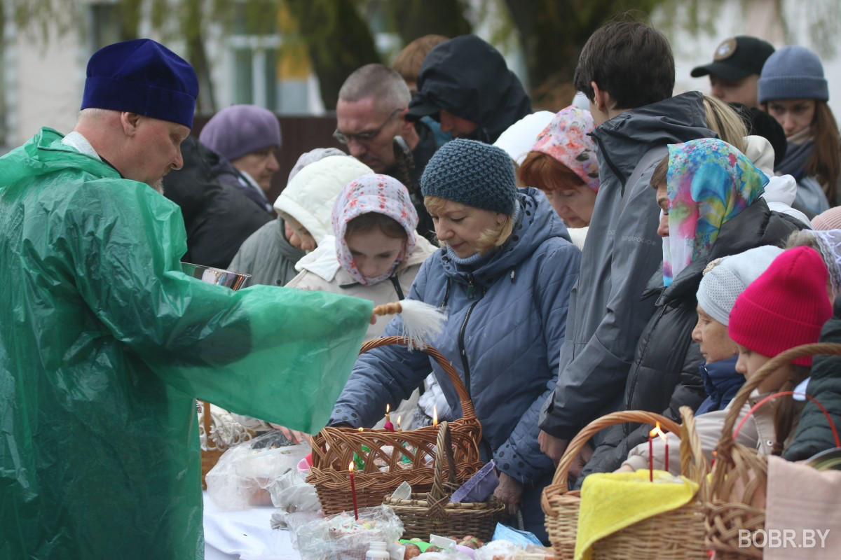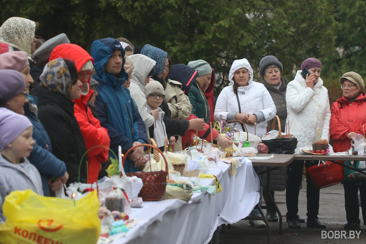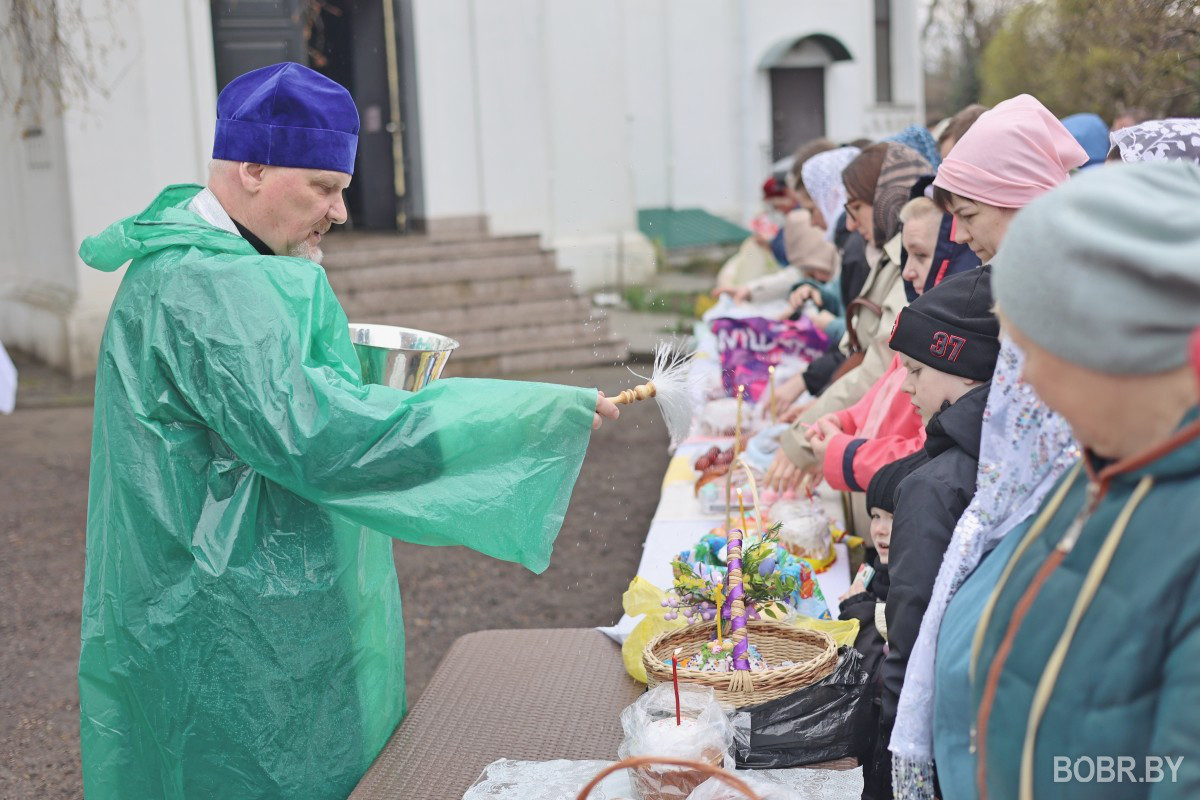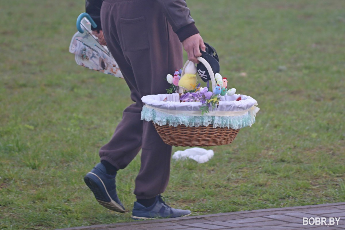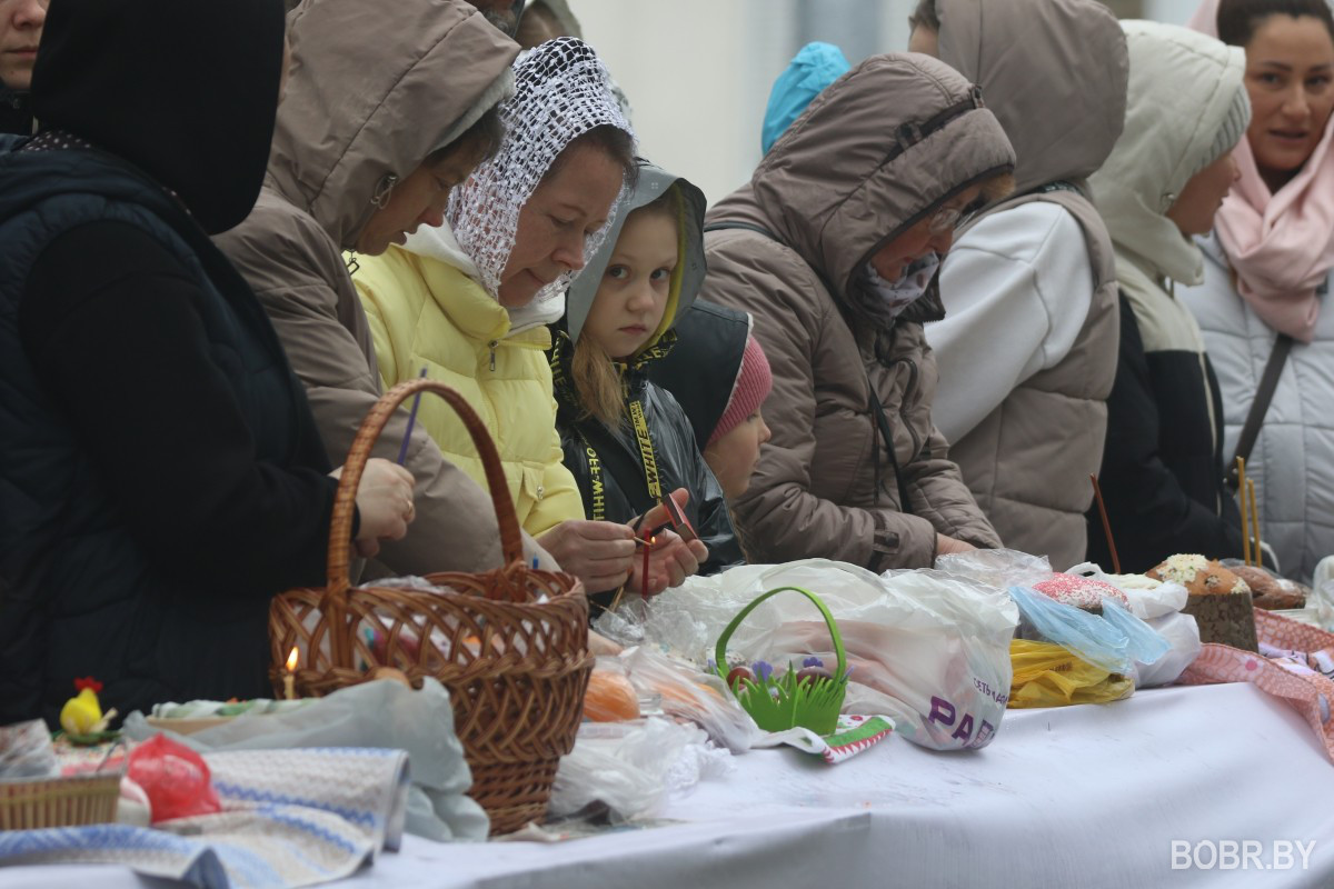 Красивые пасхальные корзинки и один из самых важных православных праздников. В субботу прихожане были окроплены не только священниками, но и мелким весенним дождиком. Бобруйчане приходят на освящение пасхальной трапезы целыми семьями, вместе с детьми.