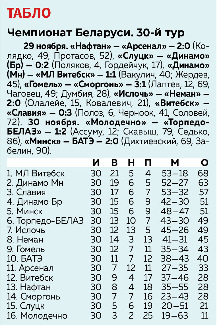 К сожалению, не всем командам удалось сохранить прописку в элите. Высшую лигу покидают "Молодечно" и "Слуцк". Однако, для бобруйской команды "Белшина", занявшей третье место во втором эшелоне, еще есть шанс вернуться в высший дивизион. Им предстоит провести стыковые поединки за сохранение места в высшей лиге против "Сморгони".