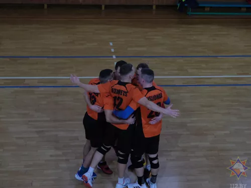 Жаркая борьба за мяч над сеткой. В Бобруйске проходит турнир пожарных-спасателей