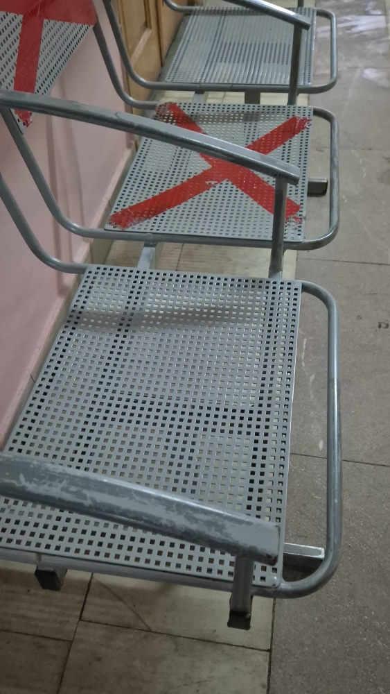 Железные стулья в больнице, где на первом этаже не жарко. Как сидеть на них? В шубе надо приходить.
