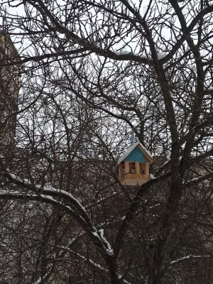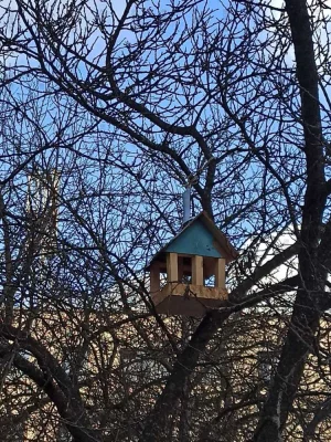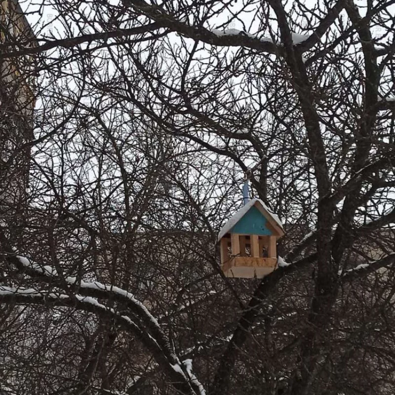 Крутая кормушка. Но как туда кладут ком для птиц? Очень высоко