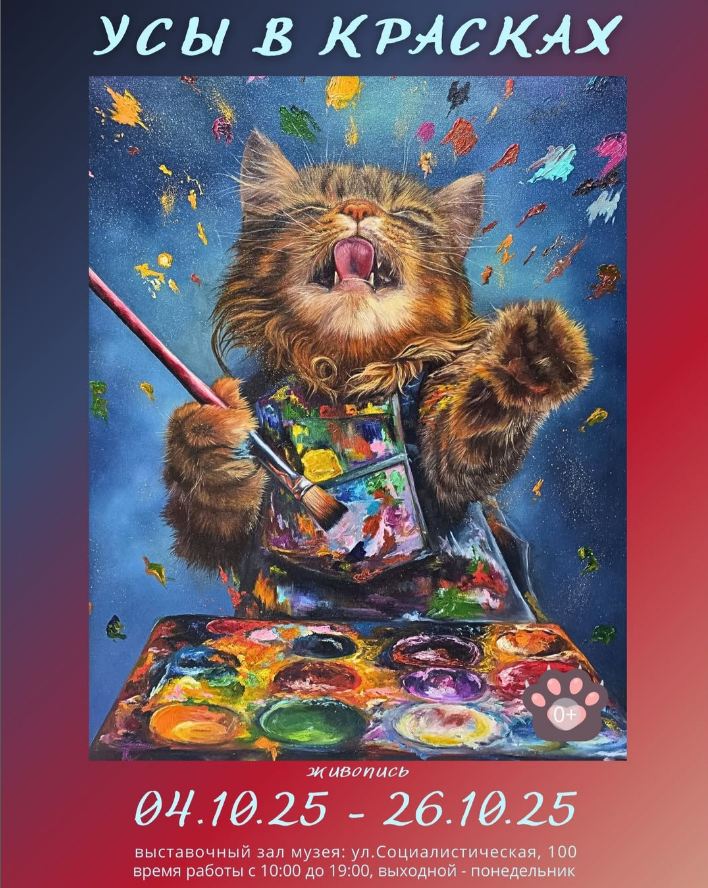 Впервые в Бобруйске своё творчество демонстрируют участники светлогорского клуба "Креатив" (руководитель - Александра Вадимовна Малаева). Выстака "Усы в красках" приуручена ко Всемирному дню защиты животных, и откроется в рамках выставки кошек, которая будет проходить в выставочном зале музея 4-5 октября.