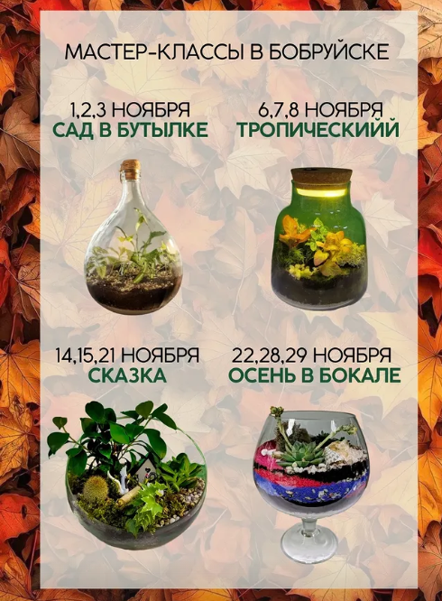 1, 2, 3 ноября – «Сад в бутылке».6, 7 ноября – «Тропический».14, 15, 21 – «Сказка».22, 28, 29 – «Осень в бокале».