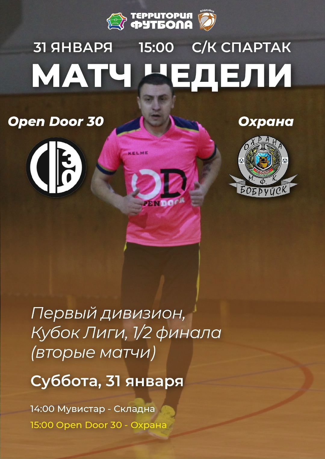 14:00 Кубок Лиги 1/2 финала (вторые матчи) Мувистар - Складна15:00 Кубок Лиги 1/2 финала (вторые матчи) Open Door 30 - Охрана