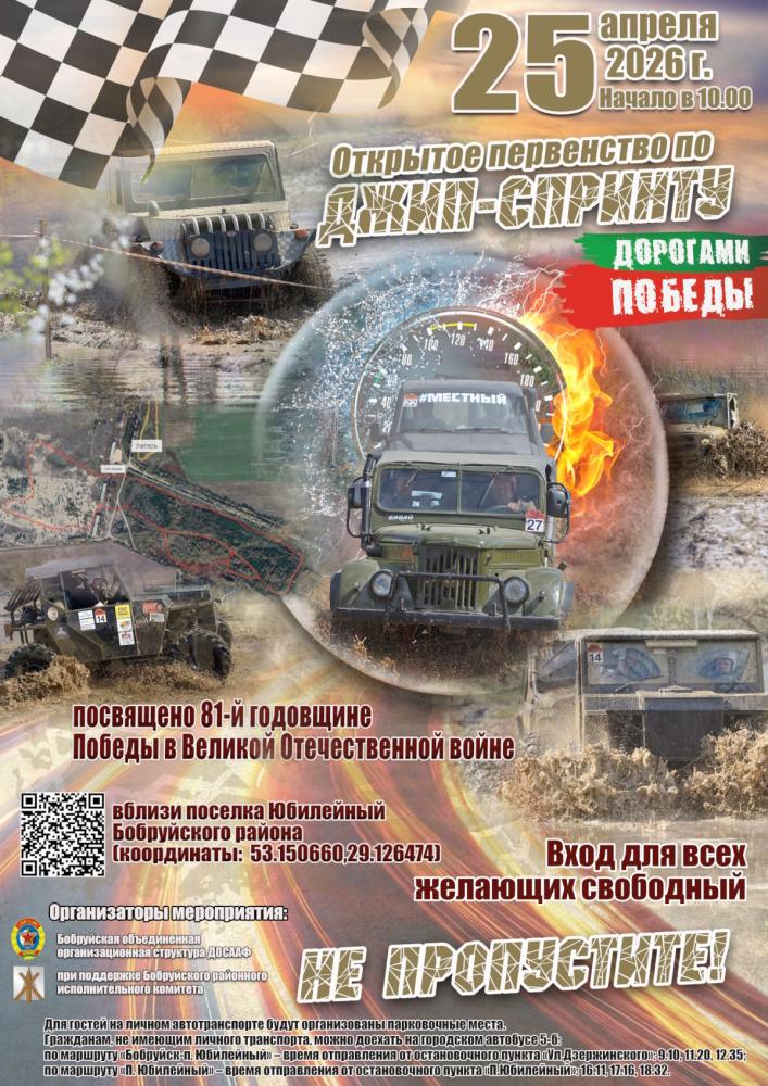 Зрелищные соревнования на внедорожниках «Джип-спринт» собирают автоэнтузиастов 25 апреля 2026 года в Бобруйском районе на бывшем стрельбище рядом с посёлком Юбилейный и микрорайоном Киселевичи (координаты 53.150660, 29.126474). На экстремальном шоу заряд положительных эмоций обеспечен и участникам, и зрителям соревнований.